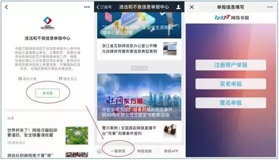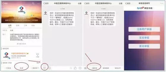 如果您更习惯使用微信,您也可以通过关注微信公众号“违法和不良信息举报中心”,点击“发消息”,在对话窗口下方选择“一键举报”,进入移动端举报页面。