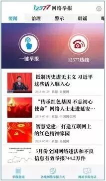 您还可以在各大应用市场搜索下载“网络举报”APP。“网络举报”APP设置了“一键举报”入口,开通了一键拨打12377举报热线功能,还会定期为您推送更全面更权威的网络治理举措、网络安全知识、举报中心工作动态等资讯文章,让您在享受互联网给生活带来的便利的同时,更安全地使用互联网。